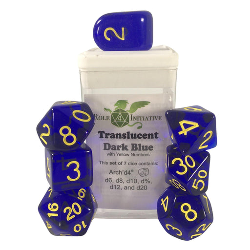 Standard size Semi-translucent 7-Piece set includes: D4 (1), D6 (1), D8 (1), D10 (1), D12 (1), D20 (1), D100 (1)