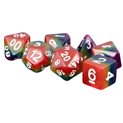 Standard size Opaque with swirls of colour and a high gloss finish 7-Piece set includes: D4 (1), D6 (1), D8 (1), D10 (1), D12 (1), D20 (1), D100 (1)